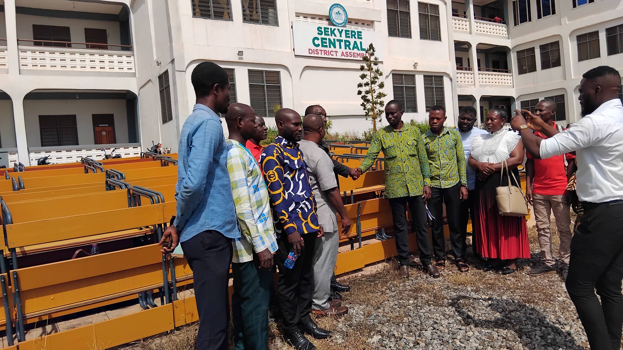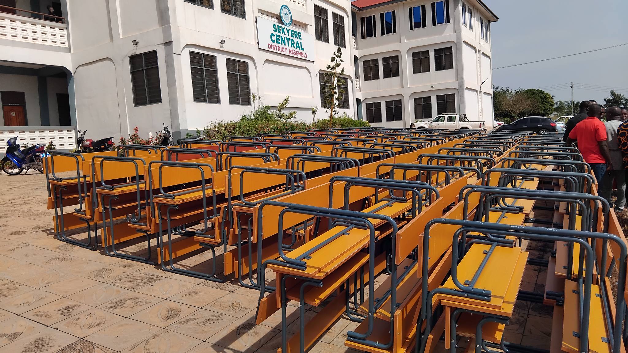 The District Chief Executive (DCE), Hon. Samuel Somuah, earlier today, presented essential classroom furniture to the District Education Directorate for distribution to some selected schools. The donation included 145 dual desks, 30 kindergarten hexagonal tables and chairs, and 20 sets of tables and chairs for teachers.